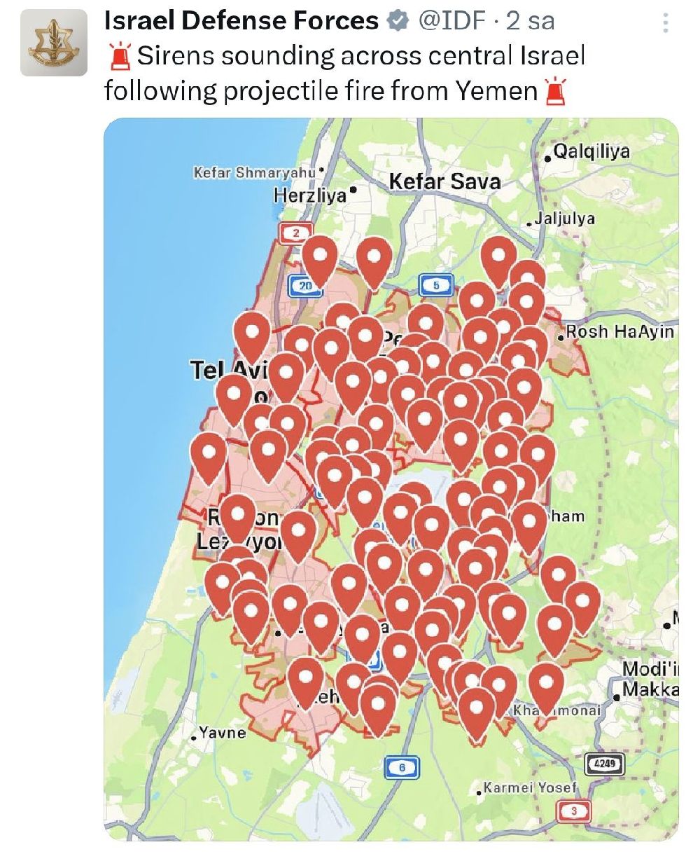 İsrail ordusu, Yemen’den fırlatılan bir füze nedeniyle ülkenin birçok bölgesinde sirenlerin çaldığını duyurdu. Füzenin hava savunma sistemi tarafından engellendiği bildirildi.