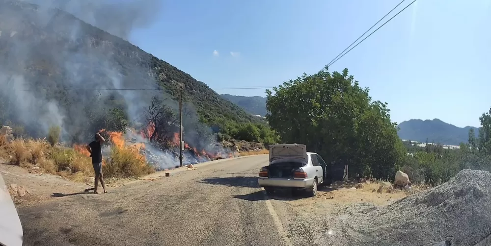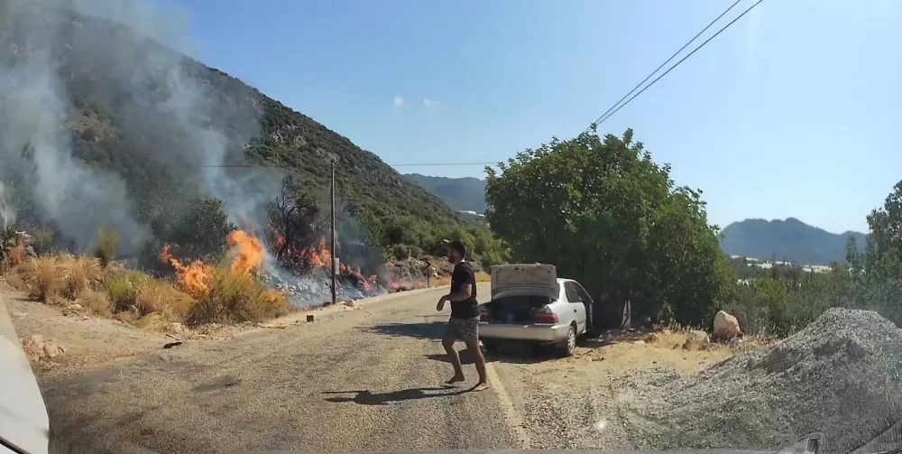 Antalya'nın Kaş ilçesi Kekova yolu istikametinde çıkan yangın, bölgeden geçen tatilci aile tarafından araçtaki yangın tüpüyle müdahale edilerek vatandaşların da desteğiyle kısa sürede söndürüldü. O anlar ailenin aracının kamerasına yansıdı.