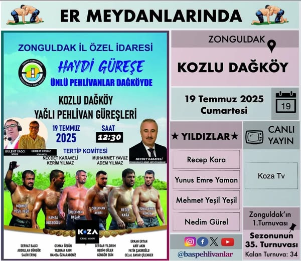 Zonguldak’ın Kozlu ilçesine bağlı Dağköy’de geleneksel hale getirilmesi hedeflenen Kozlu Dağköy Yağlı Güreşleri, 19 Temmuz 2025 Cumartesi günü düzenlenecek. Türkiye Geleneksel Güreşler Federasyonu (TGGF) takvimine göre sezonun 35. güreşi olarak gerçekleştirilecek organizasyon, bölgedeki güreşseverleri bir araya getirecek.